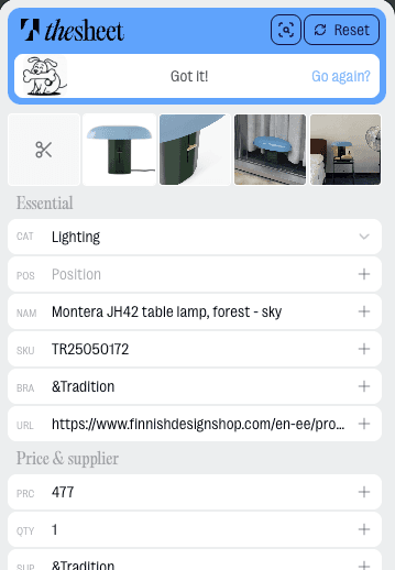 Yes — with thesheet’s Chrome product clipper, you can grab product images, names, links, and notes from nearly any website and drop them straight into your library or spec sheet. It’s the fastest way to build your design selections without the copy-paste chaos.