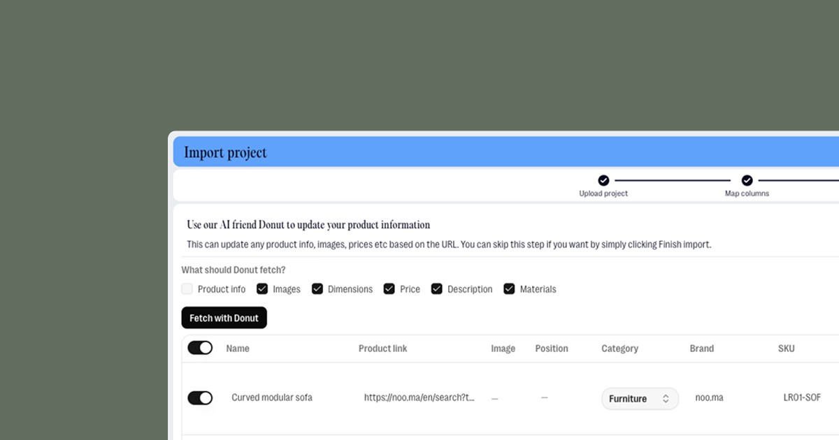 If your products have URLs, our AI-helper Donut can fetch the latest product information — images, dimensions, pricing, and other details — directly from the source.