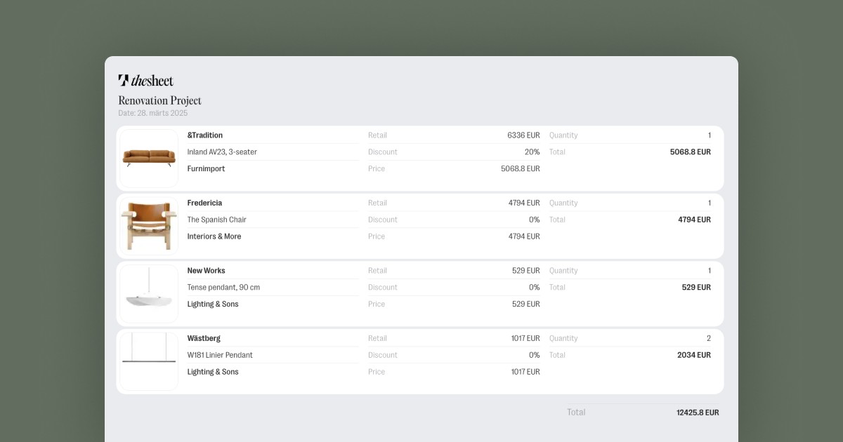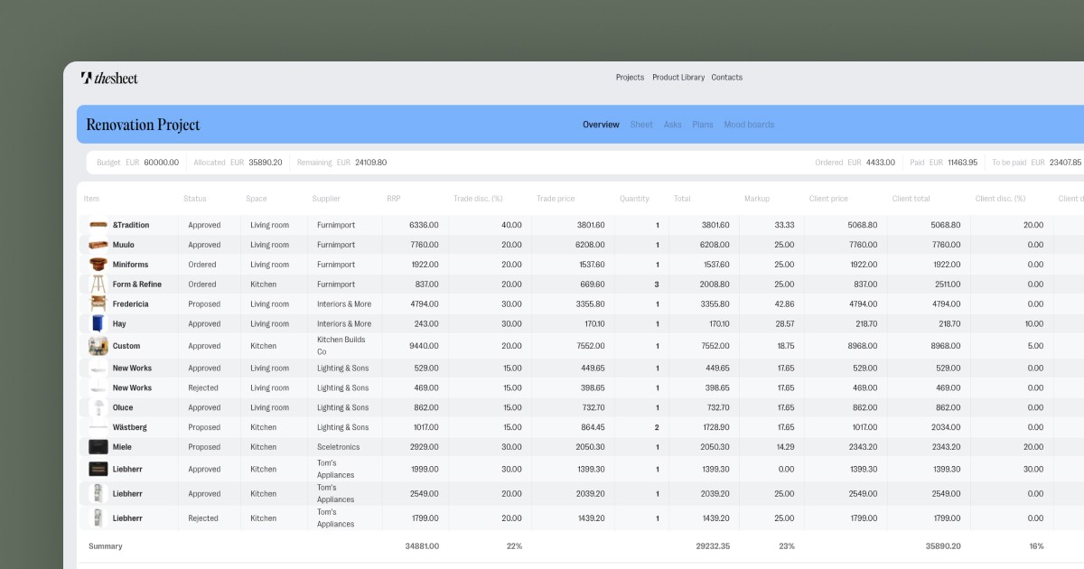 Stay on top of what’s been paid—by you or your client. Mark products as paid with a simple click, so there’s no confusion over outstanding costs. The overview bar gives a quick snapshot of total spending, remaining budget, and the value of products already ordered.